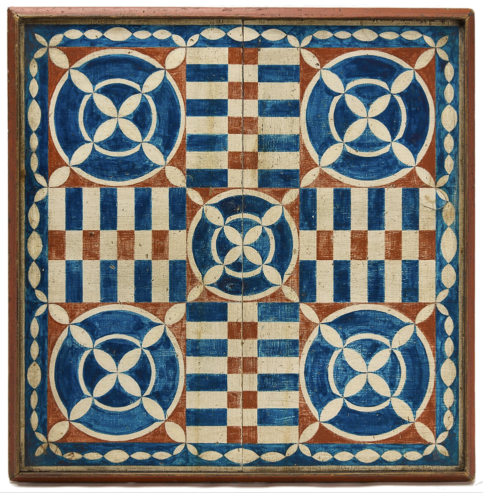 Parcheesi gameboard. Original paint on wood panel. American. 19th century.