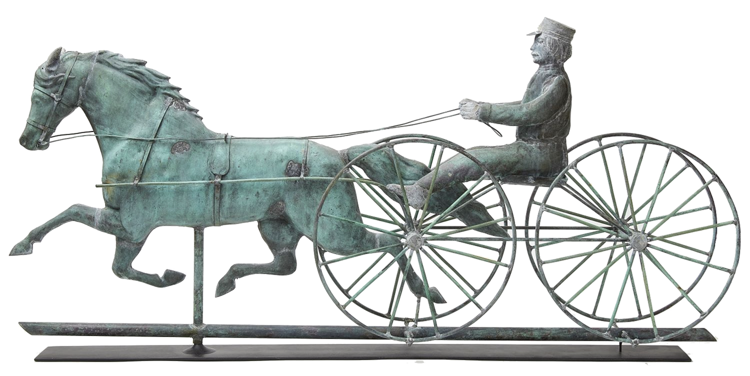 Rare horse with four wheel sulky weathervane. Copper and zinc with a natural verdigris patina.