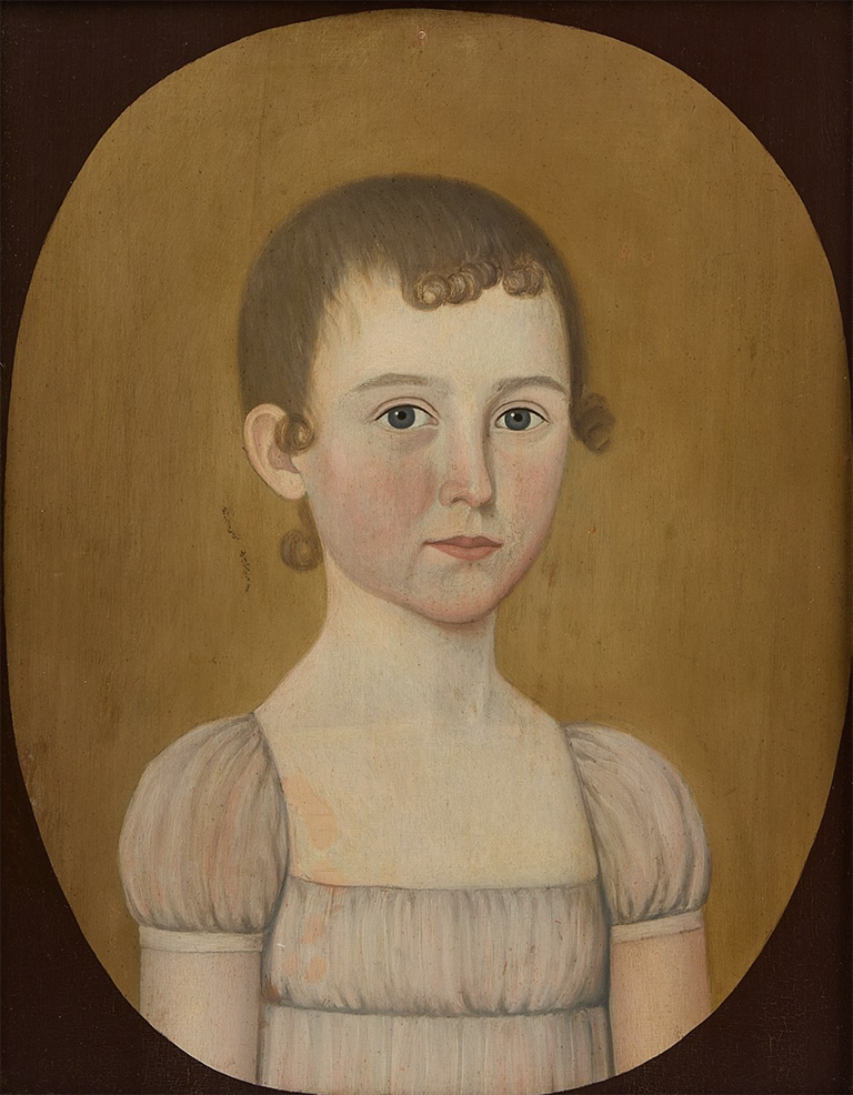 John Brewster (1766-1854). Portrait of a young girl in a white dress. Oil on wood panel.