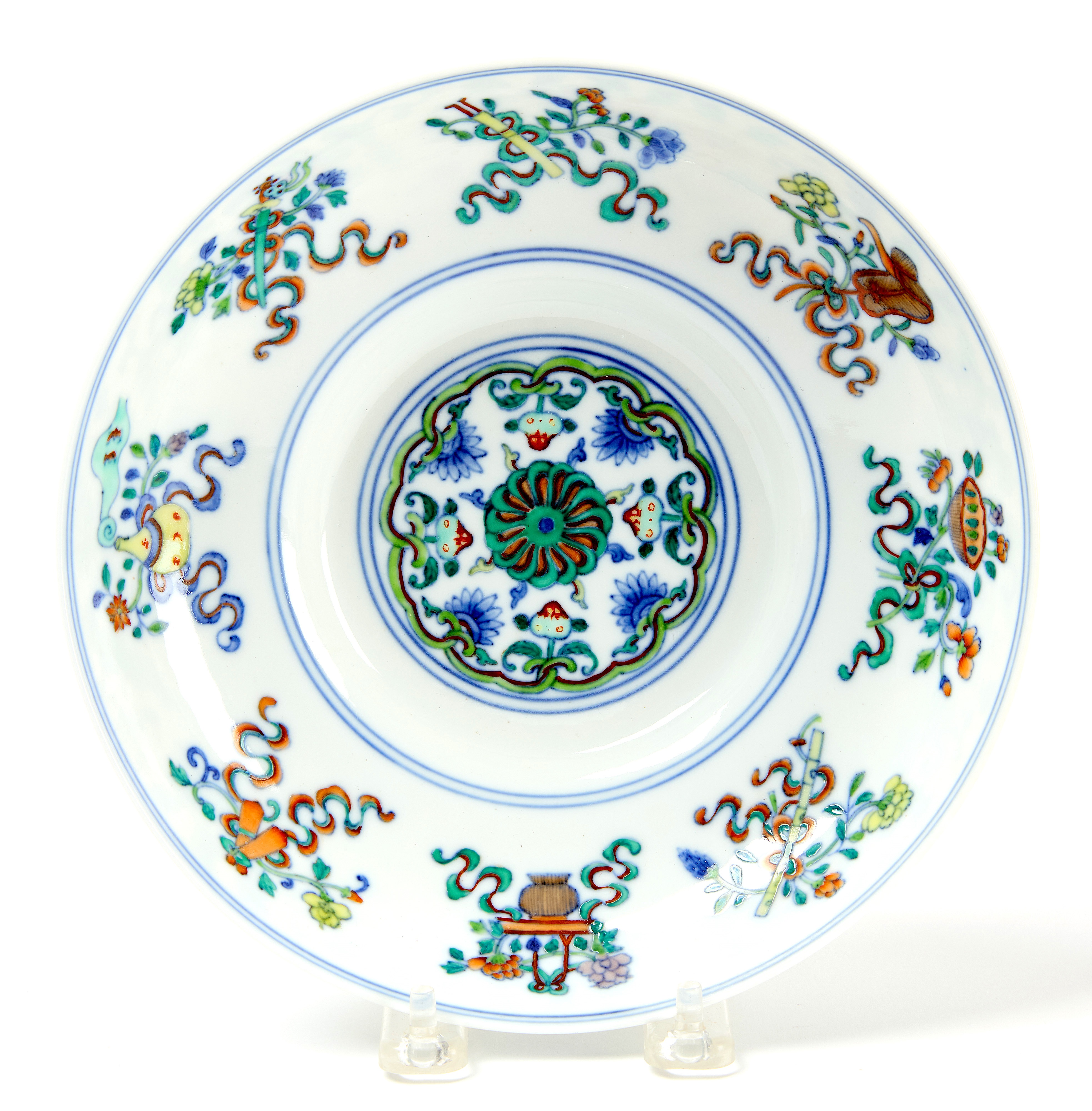 Chinese Doucai porcelain bowl. Guangxu mark. Blue and green designs. D: 8 in. Provenance: Sold in 1998 by Sothebys Hong Kong to the Greenwald Collection.
