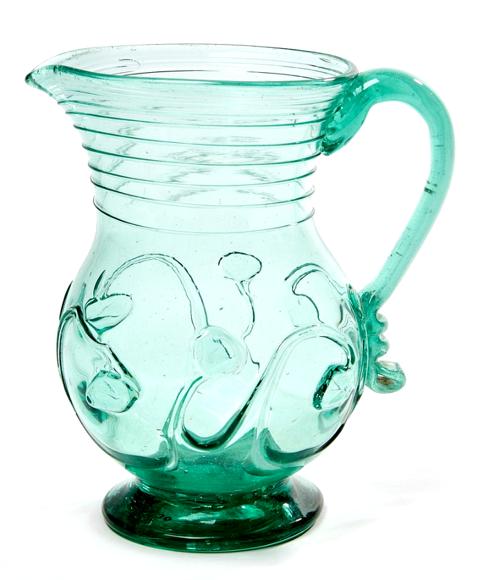 Exceptional large aqua lily pad pitcher with threaded neck. Type 2-3. Matt Johnson, Harrisburg, NY, 1841-1842. H 8" W ( including handle) 6-5/8".