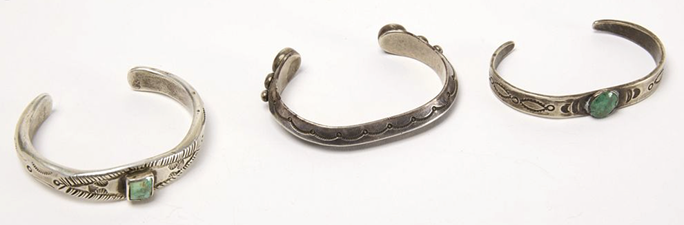 Three good old Navajo bracelets. Silver and turquoise. 1. Round turquoise stone at either end. W 3/8" D 1/4" Circumference 7" . 2. One square turquoise stone in center W at widest 5/8" D 1/4" Circumference 7-1/4" . 3. Round turquoise stone in center H 3/8" D 1/8" Circumference 7". Total 5.33 ozt.