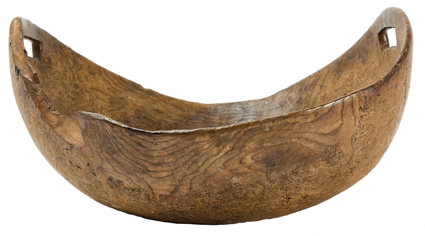 Early Native American carved burl bowl with handles. Unusual "free edge" is in the making. 18th century.