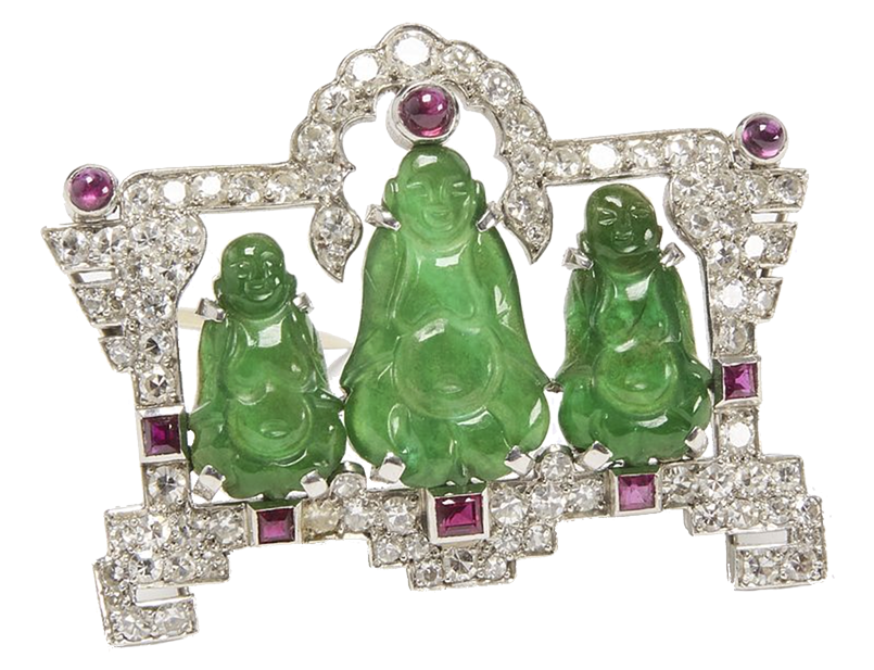 Fine Cartier Art Deco diamond, rubies and jade brooch. Stamped Cartier. Done in platinum (acid touchstone tested) mounting, forged and hand assembled.