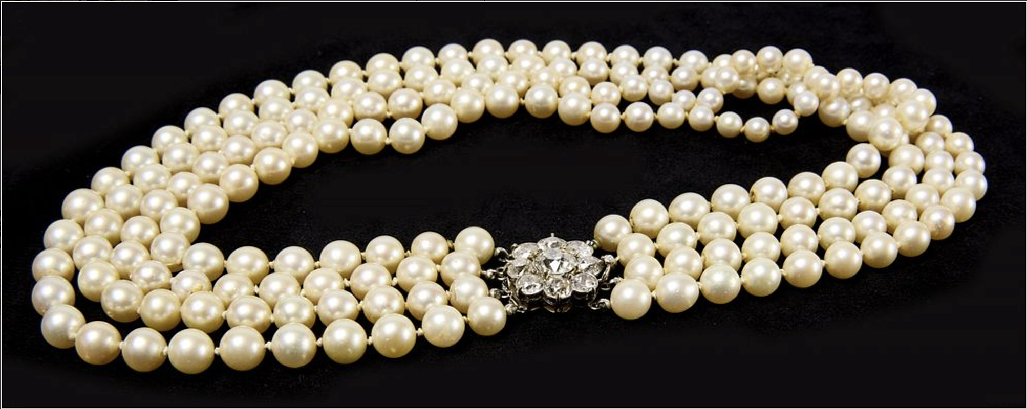 Semi-Baroque cultured Akoya pearl necklace with diamond clasp (2.8 carat center diamond).
