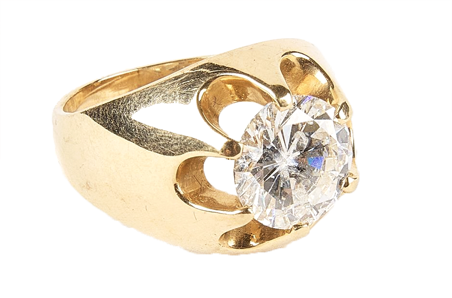 Diamond and 14K gold ring. The round brilliant cut is H I1 with an estimated 3.9 ct. 10.02mm x 10.04 x 5.97mm. Ring size: 9.25.